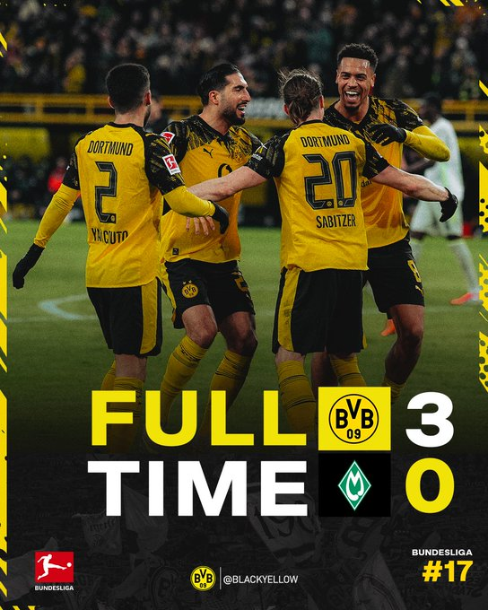 北京时间1月14日03:30,德甲联赛第17轮,多特蒙德坐镇主场迎战云达不莱梅。上半场施洛特贝克头球破门,多特蒙德暂1-0不来梅;下半场萨比策为多特再下一城,吉拉西锁定胜局,最终多特蒙德3-0不来梅,距榜首8分,继续位居第二位。